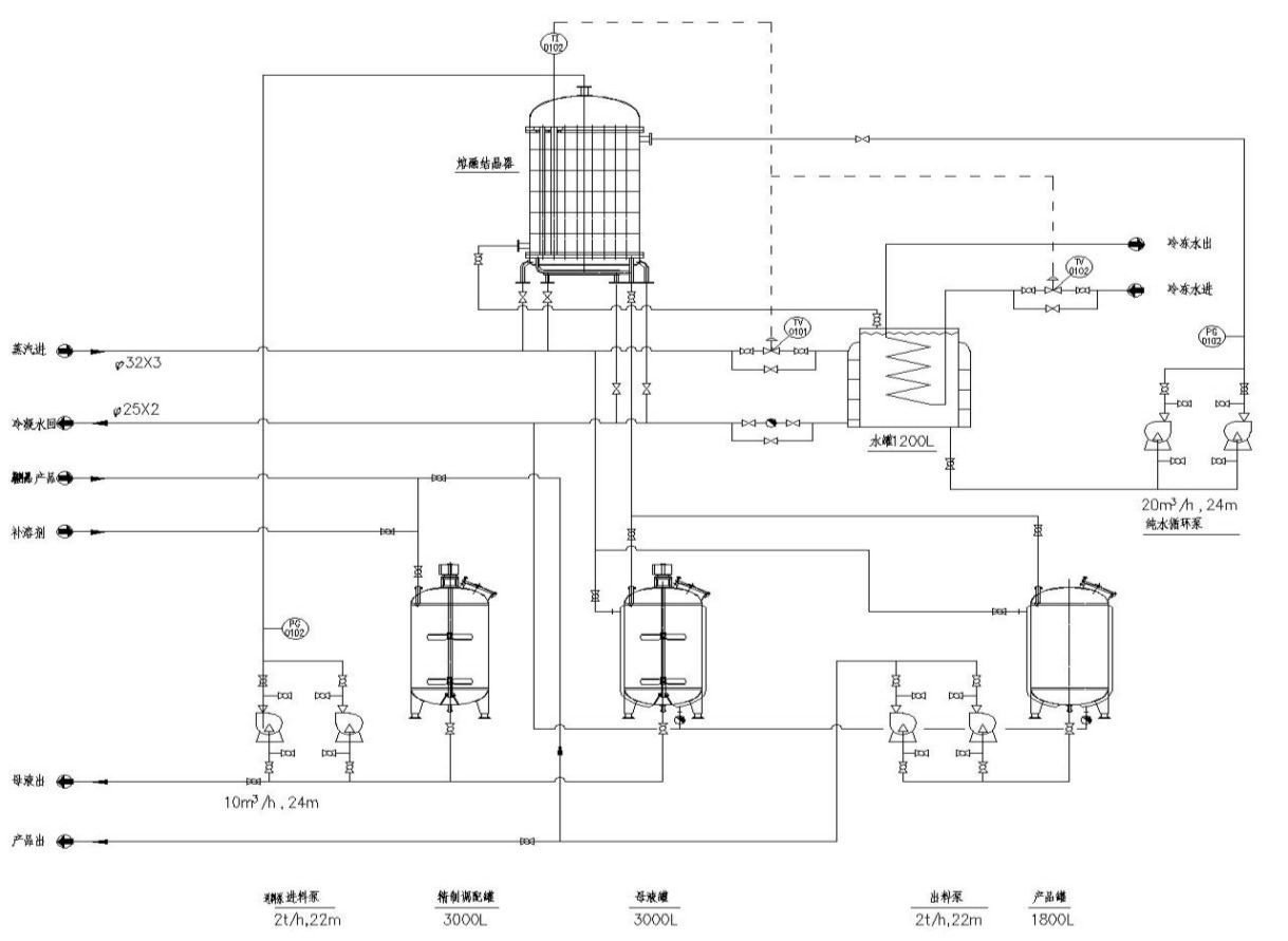 若不帶殘?jiān)礈旆蛛x系統(tǒng), 若加的料是較純的,這樣將損失產(chǎn)品, 因此需分離殘?jiān)? 以提高收率。過程產(chǎn)生的廢蒸汽相應(yīng)可濃縮雜質(zhì), 實(shí)際上, 每批加工收集到的殘?jiān)e存到可裝滿結(jié)晶器時再加工, 可以用多級洗滌分離進(jìn)一步減少殘?jiān)?。在多級殘?jiān)?共熔點(diǎn)組分都是相近的, 所以可一起回收。