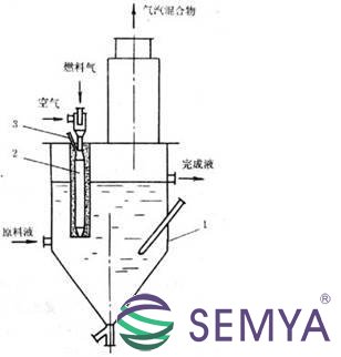 前述的各種蒸發(fā)器都是間接加熱的,工業(yè)上有時還采用直接加熱蒸發(fā)器,圖5—7所示的浸沒燃燒蒸發(fā)器就是直接加熱的蒸發(fā)器。將一定比例的燃燒氣與空氣直接噴人溶液中,燃燒氣的溫度可高達1200~1800℃,由于氣、液間的溫度差大,且氣體對溶液產生強烈的鼓泡作用,使水分迅速蒸發(fā),蒸出的二次蒸汽與煙道氣一同由頂部排出。
